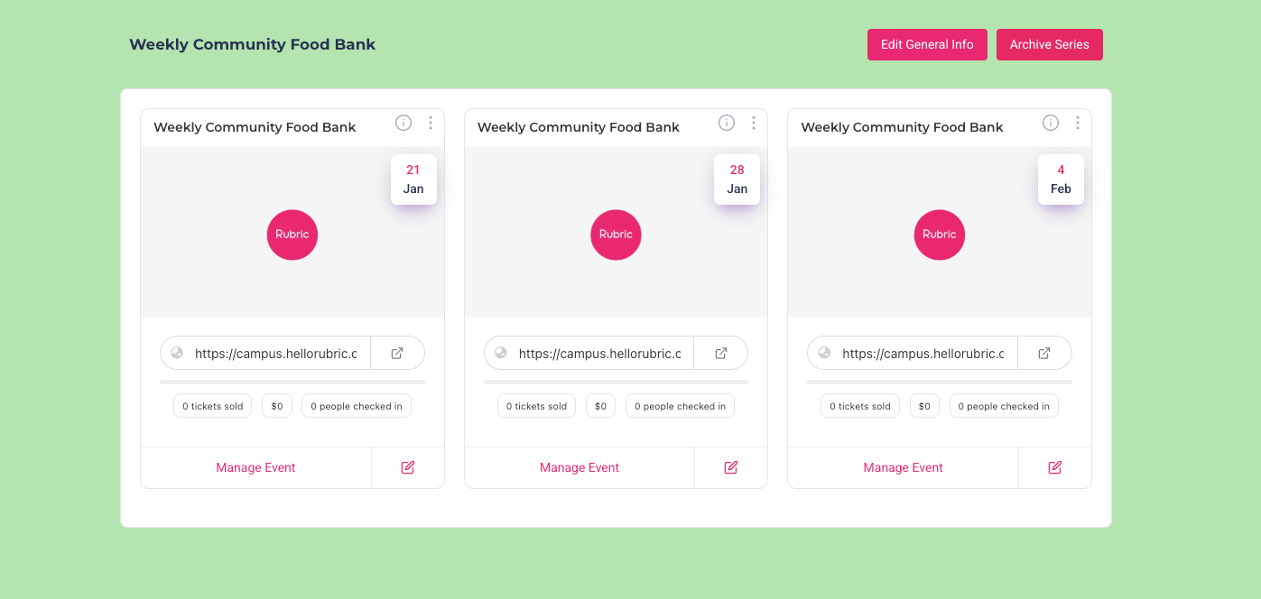 View, edit, update, or archive recurring events at any time from the Manage Events section, giving you full control over both the series and individual events.
