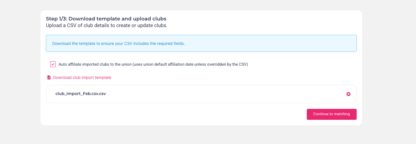 Unions can now upload a CSV file to create or update multiple clubs at once. The import flow includes: