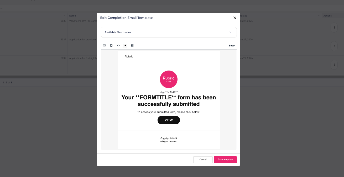 You can now edit the completion email template for forms directly within the admin interface. The editor allows you to: