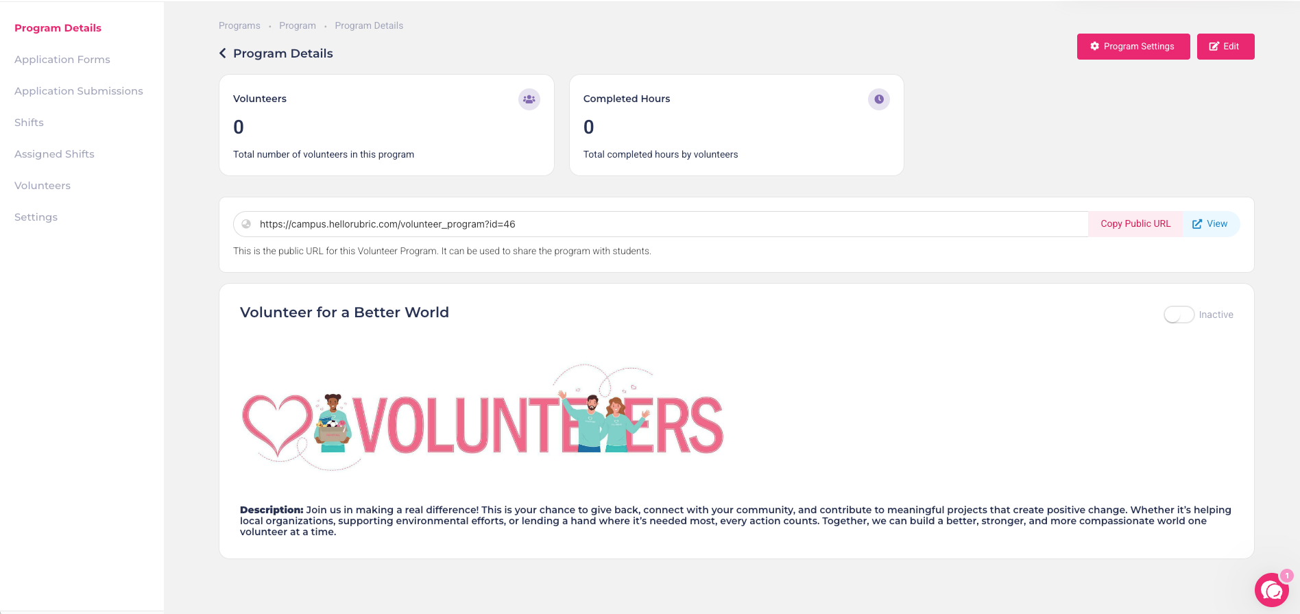 Each volunteer program can have multiple Shift Groups, enabling you to manage different activities or time periods (e.g., Orientation Week, Semester 1, Special Events) within the same program. This allows each group to run independently with its own schedule and visibility.