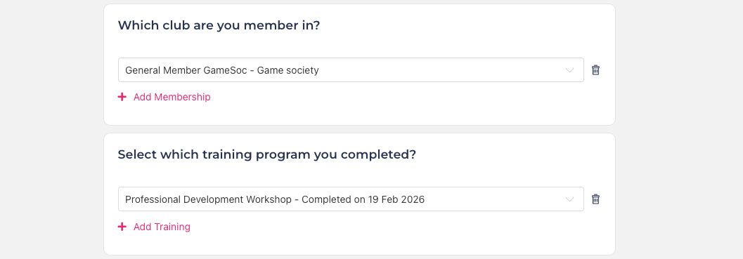 We’re excited to introduce two new Student Question types in the Rubric Form Builder: Membership Picker and Training Completion Picker. These new fields allow forms to directly reference a student’s existing data on the platform, making submissions more accurate while reducing manual input.