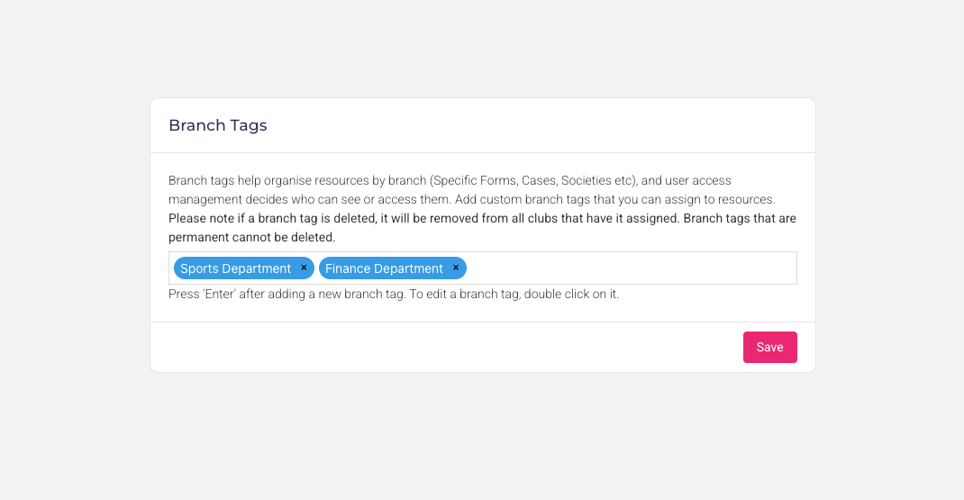 When a branch tag is assigned to a user, they can only access resources (Forms, Cases, Societies etc.) that have at least one of the same branch tags.