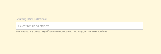On the first step of the Create Election or Edit Election screen, you’ll see a field called Returning Officers (Optional). Click the field to see a list of people you can choose from. Select as many as you need; each person appears as a tag.